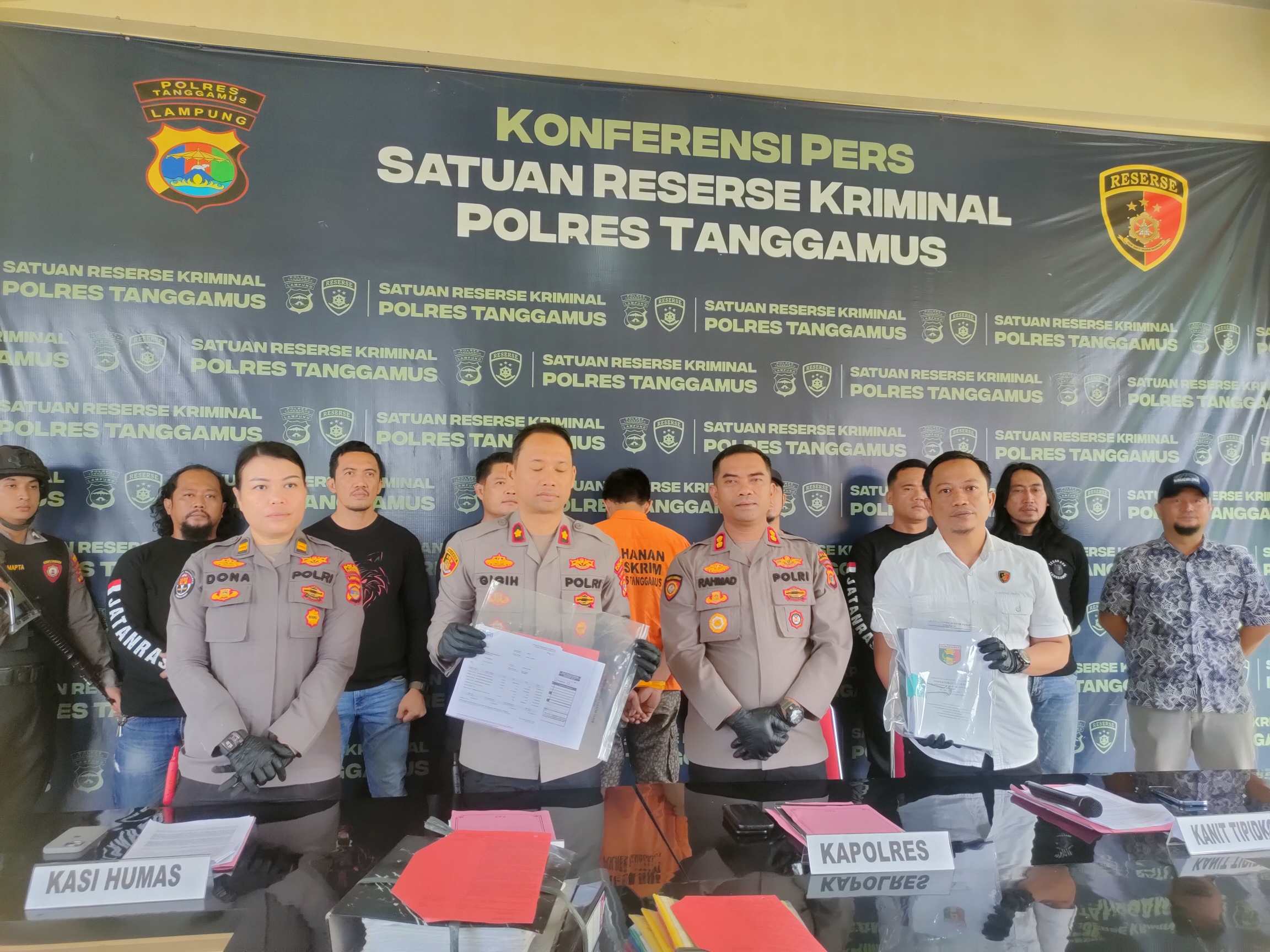 Kapolres Tanggamus AKBP Rahmad Sujatmiko saat pers rilis di basement Satreskrim mengungkapkan penangkapan terhadap F setelah adanya laporan dari masyarakat pada 3 Februari 2025 atas dugaan korupsi Anggaran Pendapatan dan Belanja Pekon (APBP) Atar Lebar tahun anggaran 2019-2021 dan tahun 2022.