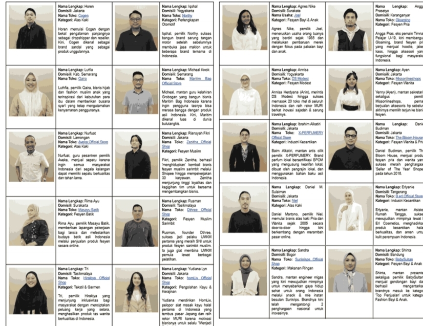Berikut ini adalah profil singkat dari peringkat 20 besar Shopee Jagoan UMKM Naik Kelas.